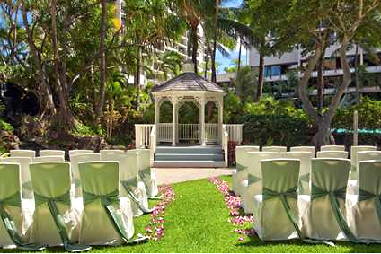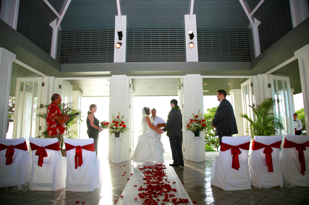 OAHUWaikiki Area MAGIC ISLAND - ALA MOANA BEACH PARK (Second Photo) located just 15 minutes from all Waikiki hotels; this is the most popular location for our Waikiki weddings. The world famous Diamond Head Volcano plus Waikiki will be in your romantic background. Ala Moana means "Path to the Sea" and this is the site of Honolulu's largest beach park as well as its huge Ala Moana Center. A 43 acre peninsula east of the park is known as Magic Island and borders Ala Wai Yacht Harbor. A permit is required. See map at Magic Island Map. HILTON HAWAIIAN VILLAGE WATERFALL GARDEN GAZEBO located at the Hilton Hawaiian Village Resort in Waikiki, Oahu. This beautiful spot features a lovely waterfall setting inside a garden and gazebo surrounded by a pond filled with colorful "good luck" carp. Feel free to add any additional services you wish. Hilton Hawaiian Village grounds fee varies. ROYAL HAWAIIAN HOTEL GARDEN WEDDING located at the historic Royal Hawaiian Hotel in Waikiki, Oahu. This quiet private garden setting is ideal for from 10 to 100 guests, or more. The hotel surrounds you in this lovely setting inside a garden. The Surf Room restaurant is a perfect ending to your wedding day with a variety of delicious selections to choose from. You may add any additional services you wish. Royal Hawaiian Hotel grounds fee varies. PRINCE KUHIO HOTEL GARDENS GAZEBO (Second Photo) located at the Hilton WaikikiPrince Kuhio Hotel in Waikiki. The beautiful picturesque gardens has a wedding gazebo where you can be married and will set up chairs for your guests. Although the location is not on the ocean, it's in the middle of Waikiki where you can pop out to the beach after the ceremony for sunset photos. Fees vary. NORTH SHORE BEACHES Normally we will indicate that you want your wedding on a North Shore Beach - To be determined. The determining factors will be worked out depending on a number of factors. We try to weigh the factors with the most likely location for a more secluded spot. All the beaches in Hawaii are public, so there is always a possibility that there will be beach goers and surfers around. We try to perform your wedding as far away from beach goers as possible to provide a clean background for your photos. Our North Shore beaches include: Kawailoa Beach, A permit is required. Pua'ena Beach, A permit is required. Ali'i Beach, A permit is required. Three tables Beach. A permit is required. Email us for descriptions and photos of these North Shore beach locations, and the factors involved in deciding which beach is best for you. WAIMEA FALLS PARK located on Kamehameha Hwy. five miles northeast of Haleiwa, Waimea Falls Park is one of the most popular locations for weddings in Oahu. With meadows surrounded by a blanket of crimson blossoms and thrushes calling from a nearby thicket, weddings are performed at the park everyday. Whether you wish to have your ceremony in the lush tropical gardens or with the waterfall as a background, you will surely appreciate this amazingly luxurious area. See our Waimea Falls Wedding Package. TURTLE BAY RESORT GLASS CHAPEL (Second Photo) located at the Turtle Bay Resort on Oahu's North Shore, this beautiful glass chapel affords 360 degree ocean views. Situated on a quiet side of the property and perched on a cliff top, this beautiful chapel seats over 60. If you like we can arrange standing flower baskets or other decorations for the chapel. The newly renovated Turtle Bay Resort is not only a picturesque place for your wedding, but is also a great place to stay and will even arrange your lunch or dinner reception following your ceremony. Ask us for a complete buffet menu. This is one of our newest locations for weddings in Oahu. See our Turtle Bay Glass Chapel Wedding Package. KUILIMA POINT - TURTLE BAY RESORT This private outside grassy area is jusr adjacent to the Turtle Bay Glass Chapel. If an indoor chapel wedding is not for you, consider the Kulima Point. With breathtaking 270 degree views of the Pacific, the kulima point location is great for groups from 2 to 50 or more. The resort will provide up to 30 chairs for your guests and you may have other wedding decoratons as well as an archway - which most couples add. This location also provides for an indoor rain alternative at no additional cost. The site fee is included in our Turtle Bay Glass Chapel Wedding Package. |